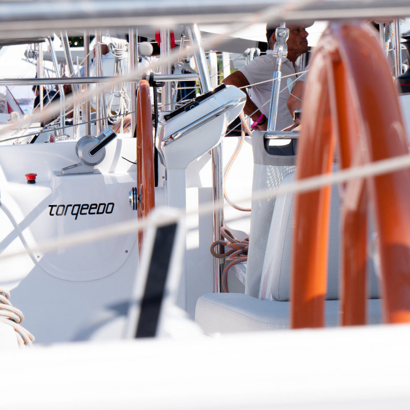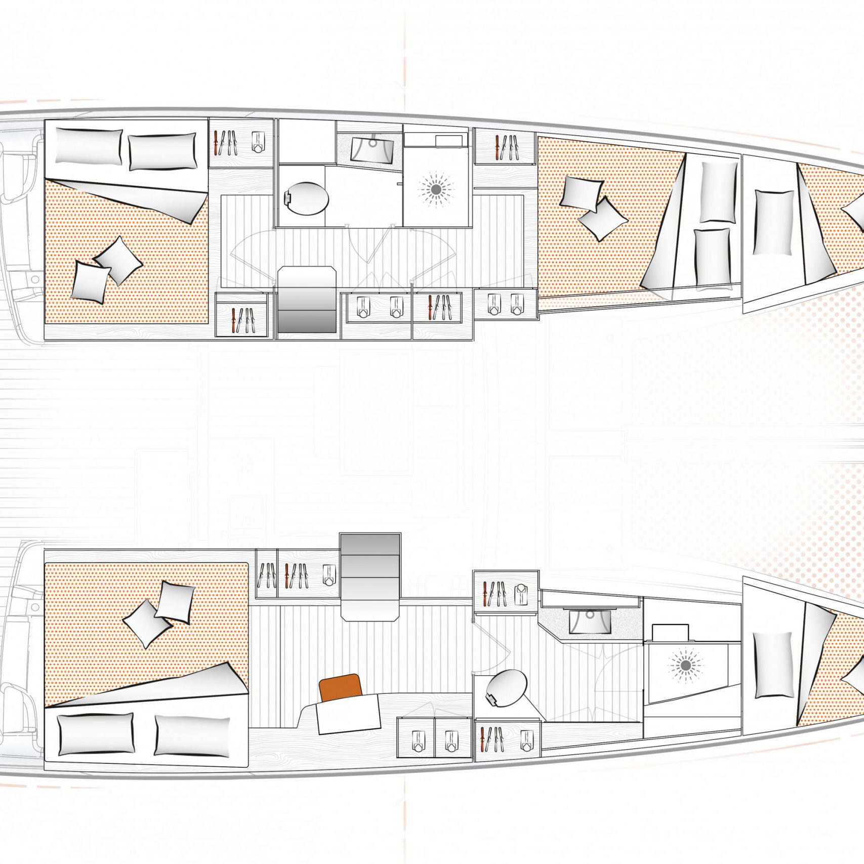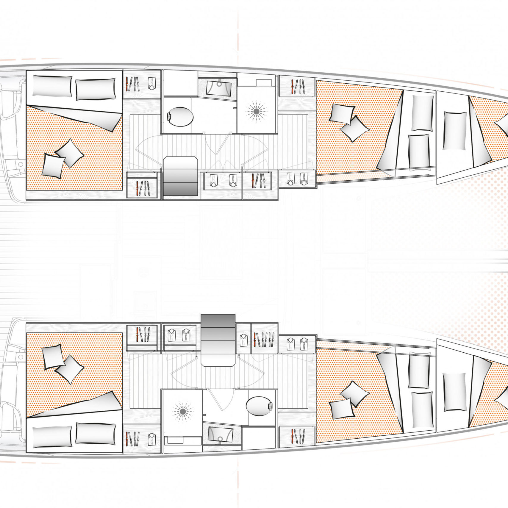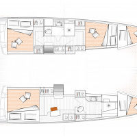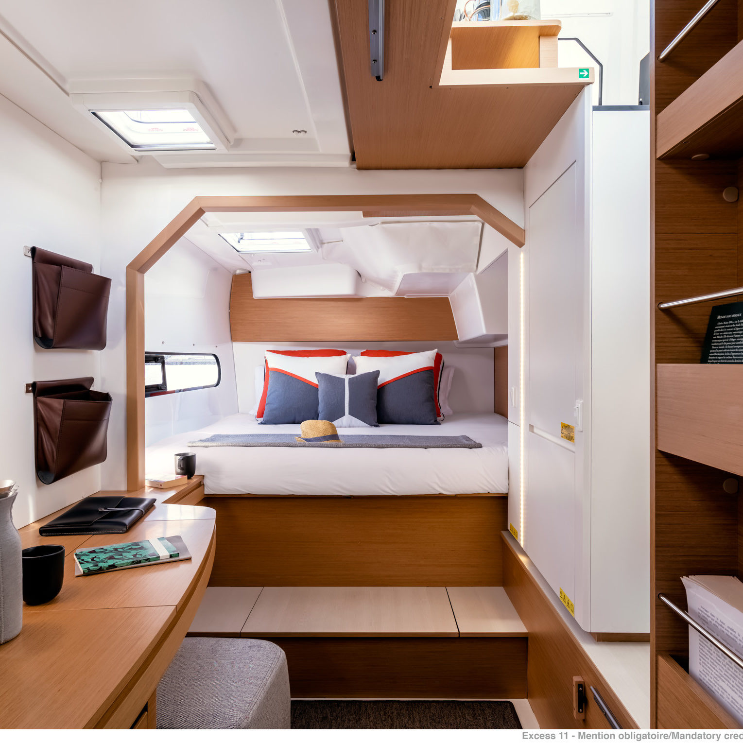 Excess 11 has benefited from the experience of her elders, without sacrificing all the comfort attributes needed for enjoyable cruising. Add to this a volume worthy of a larger boat, whether in the saloon or in the cabins, with for example a 2 by 2-meter (6½’x6½’) bed in the owner’s cabin or bathrooms with separate showers! On deck, she offers the comfort and friendliness of a large open cockpit and twin helm stations, offering both real steering sensations and direct contact with the rest of the crew.