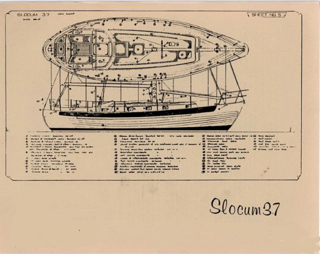 The fiberglass schedule is in accordance with procedures normally employed on yachts ten to twenty feet longer than the ” Slocum 37″