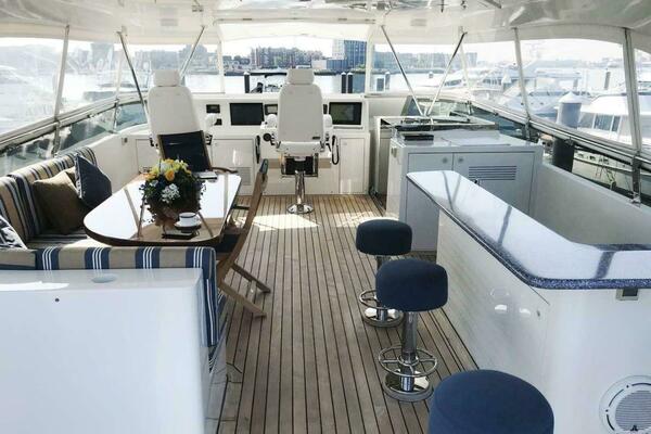 Forward up molded stairs (port and starboard) is the aft deck with one of the three dining spaces with a teak table, built in seating aft, and folding teak chairs. To port, there is a walk-up bar with refrigerator and stairs to the flybridge to starboard.