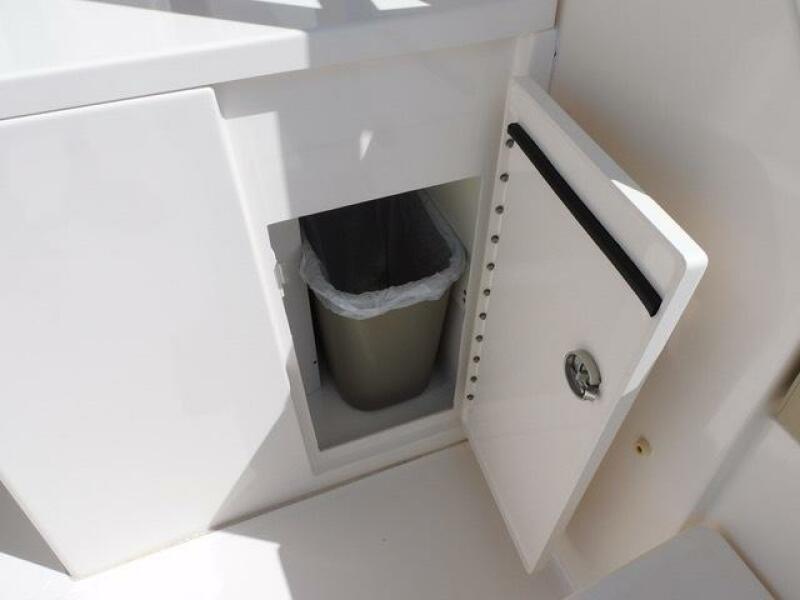 - Vacuum flush marine head with 10-gallon holding tank, macerator discharge pump, deck pump-out fitting, and bronze through hull fitting