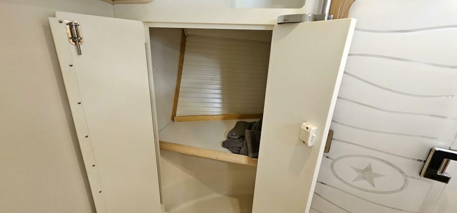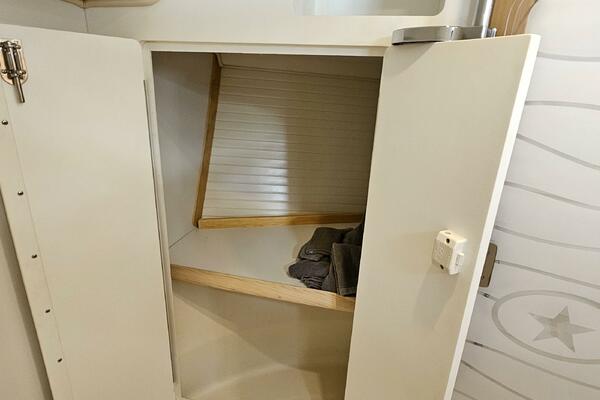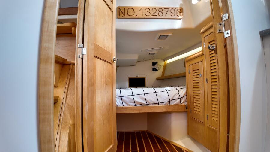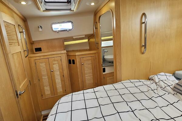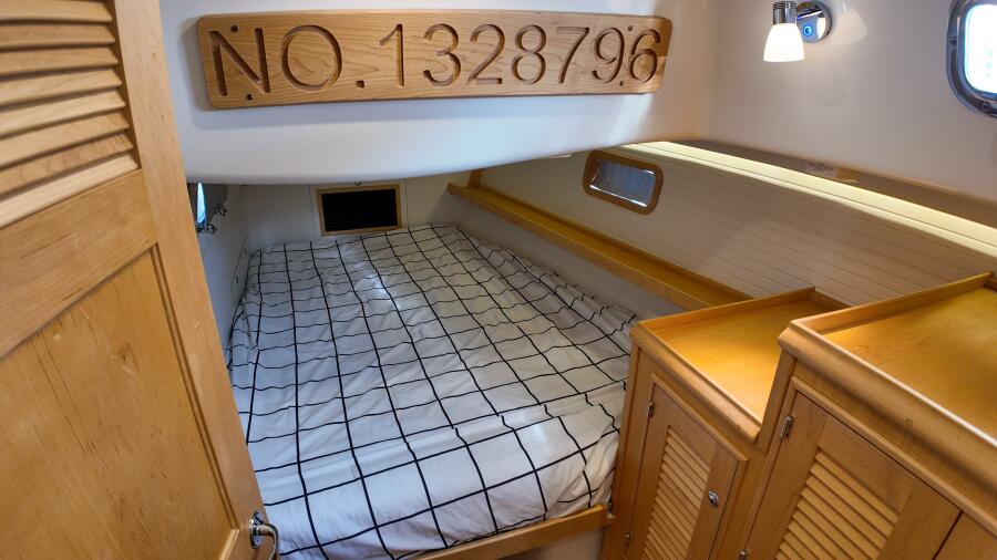 - Starboard side: settee with generous storage behind/below and lockable drawer for ship’s papers; converts to double berth