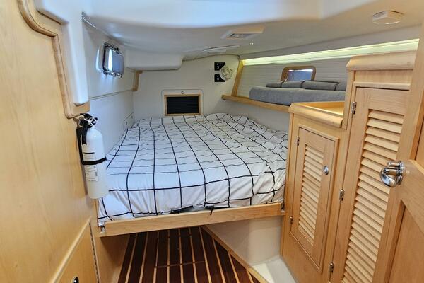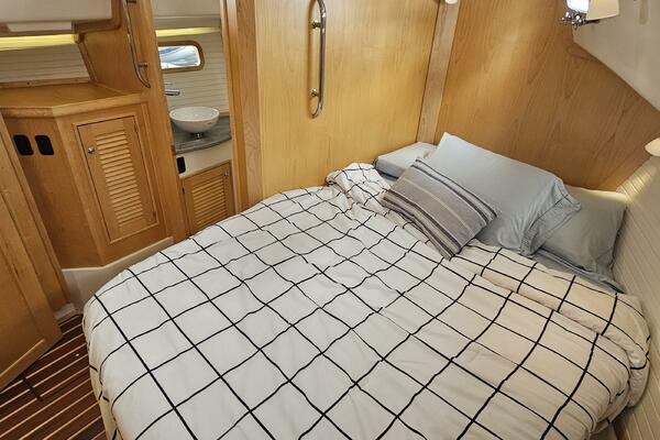 - Offset island berth with queen-size innerspring mattress (7 ½" pillow-top, tall coil) and storage beneath