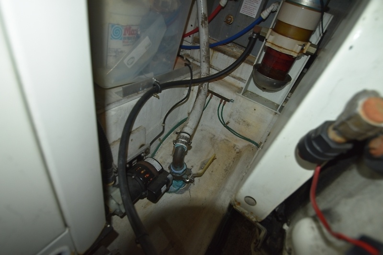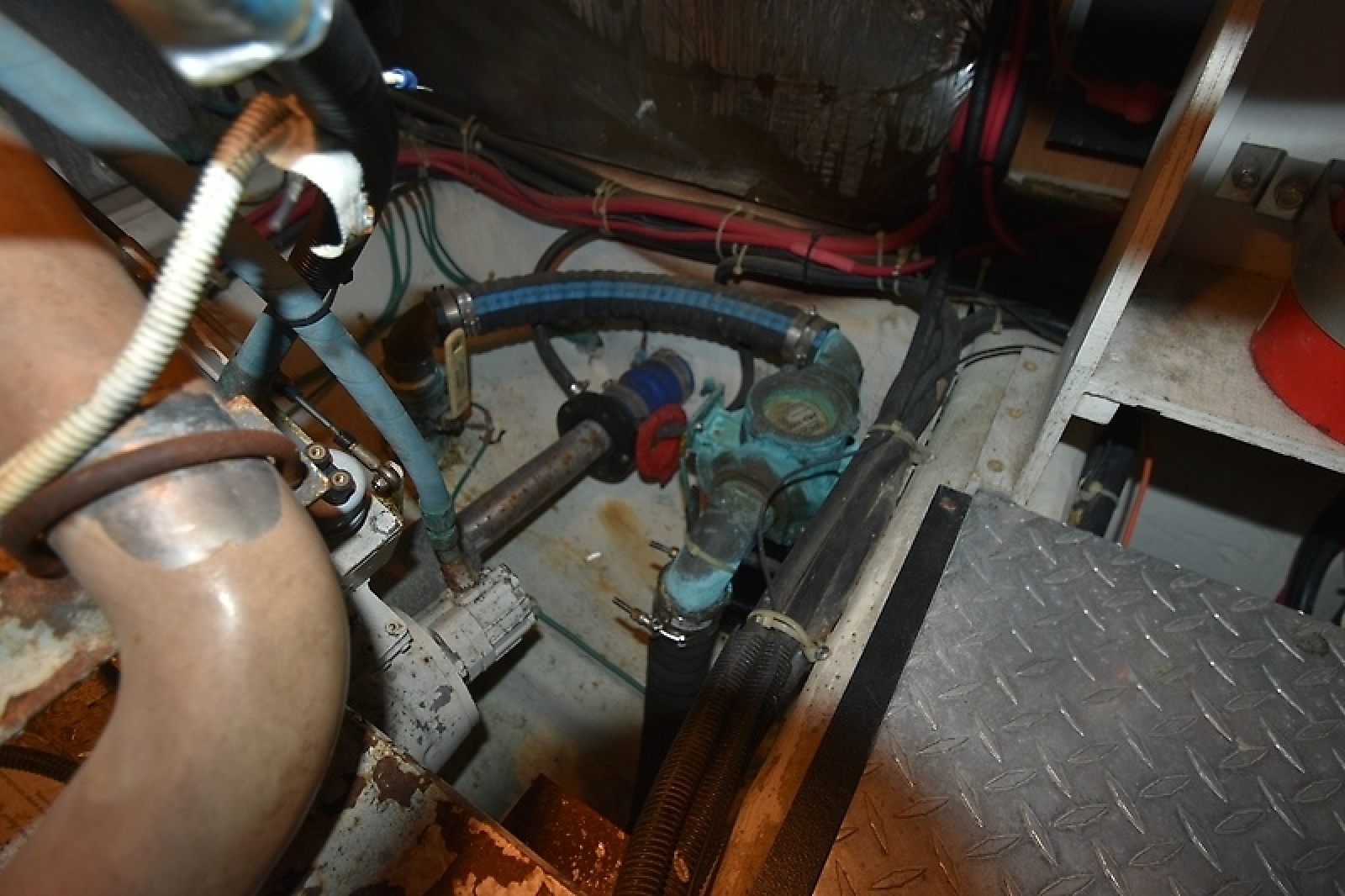 - Engine room access below the salon floor, with lighting