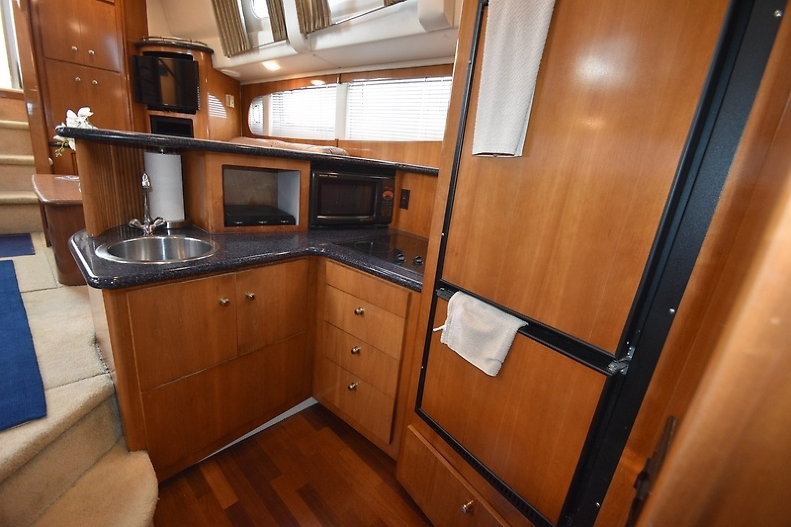 The Carver 444 Cockpit Motor Yacht is basically a Carver 396 Motor Yacht (2000–07) with a cockpit and extra fuel. This was a huge sales success for Carver. No other cockpit yacht her size can match the 444 for interior space and comfort, and none has a larger cockpit. Stepping below, the enormous full-beam interior of the Carver 444—made possible by raising the side decks to eye level—comes as a surprise. With its panoramic views and nearly seven feet of headroom, the salon dimensions are those of a much larger boat. A mid-level galley is forward to port, and both staterooms have queen berths. To save space, the forward head is split with the shower stall to port and toilet compartment to starboard. A sliding glass door in the (smallish) master stateroom opens directly into the cockpit. Wing doors and a hardtop protect the aft deck from wind and weather while underway.
