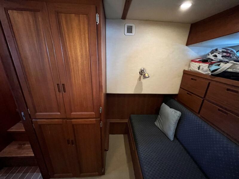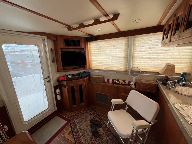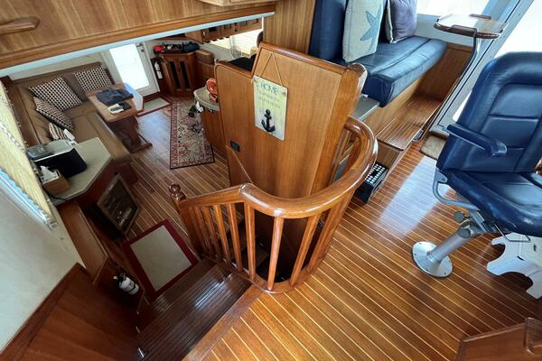 The bridge includes a substantial chart table, offers a 360-degree view, and provides direct access to the deck.