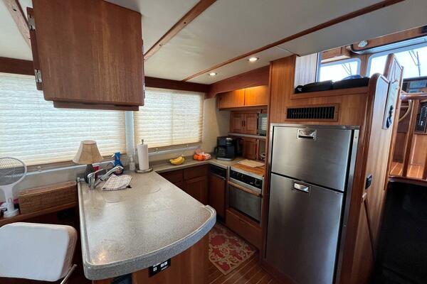 The interior features a roomy walk-around queen stateroom with a private head, a guest stateroom with a head, a U-shaped galley, and a large salon.
