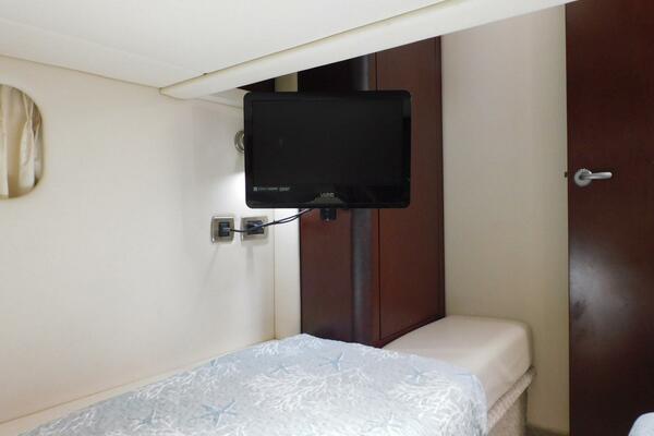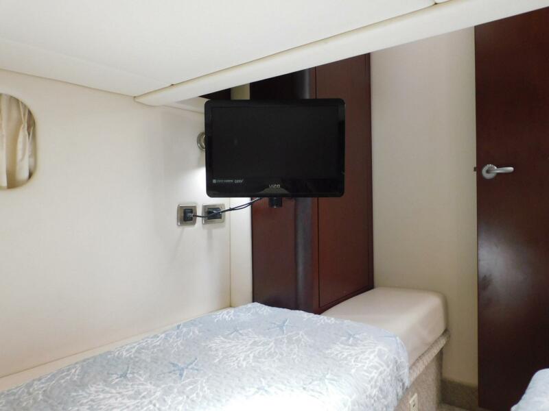 Below, a guest cabin to port has twin single beds, while the forward master stateroom features a queen-sized island berth.