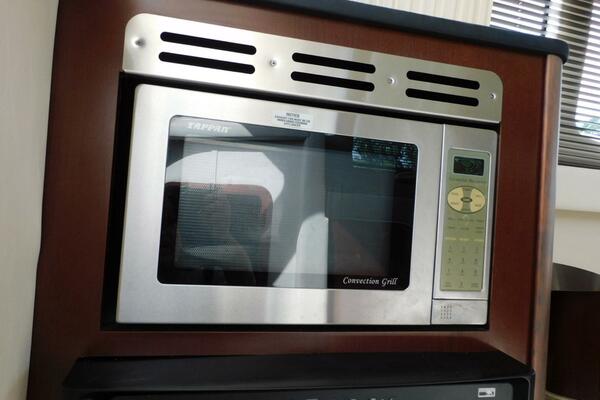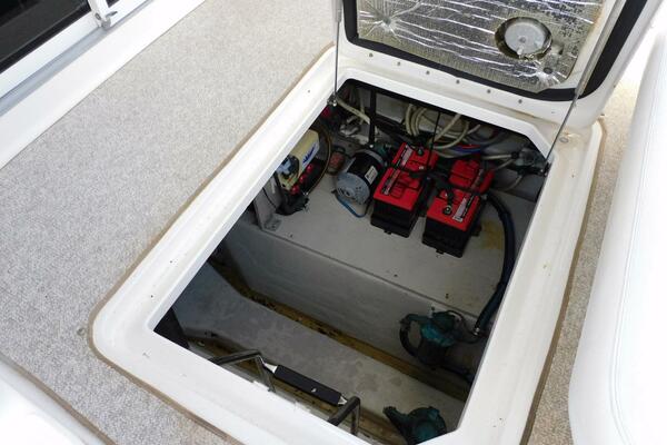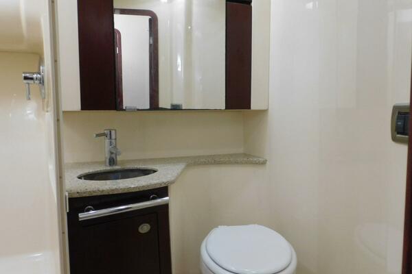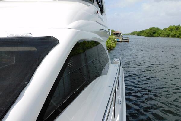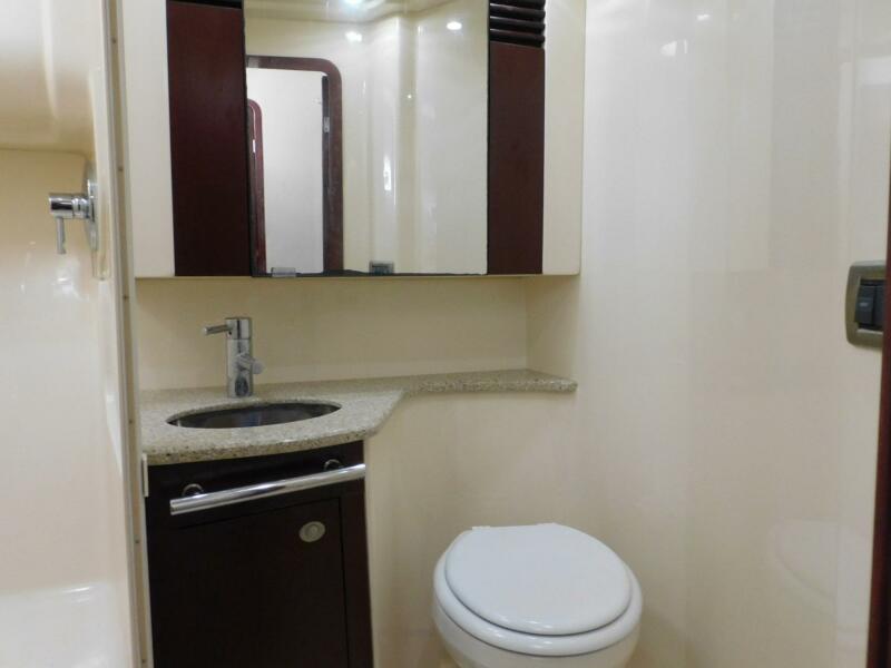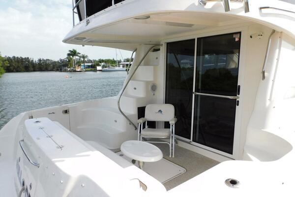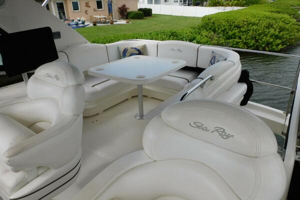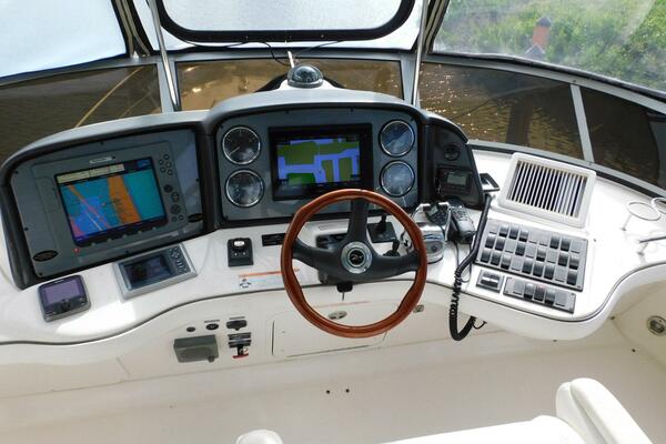A sliding glass door opens to the cockpit, which features a walk-through transom, bench seating, and molded flybridge stairs. Offering good visibility fore and aft, the extended flybridge includes a large U-Shaped aft seat with a removable table.