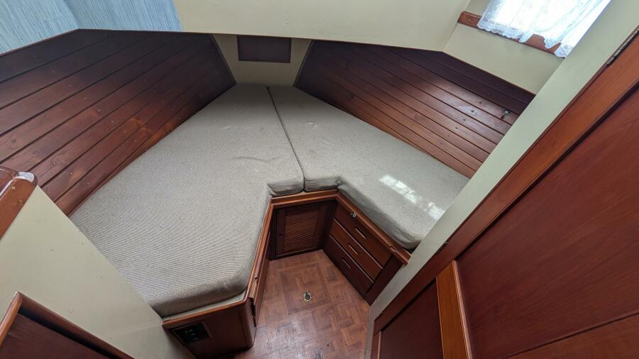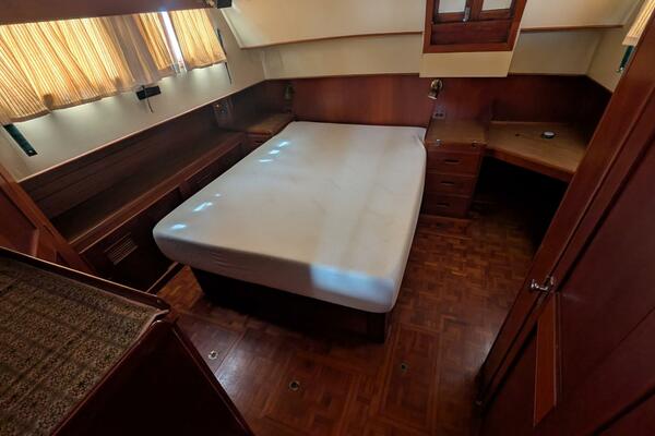 The Grand Banks 42 Classic has been decades in the making. The original Ken Smith design has been amended and updated with the practical input of her owners. The experience gained since the laying of the first GB 42 keel in 1966 is reflected in each one commissioned today. Her practical layout, sturdy fiberglass construction, deep water design, and long range capability all add up to a complete cruising boat. The Grand Banks semi-displacement hull design, with a fine entry forward, hard chines aft, and a full keel has been proven on waters around the world. Single or twin diesel power will deliver economy at hull speed and provide higher cruising speeds when larger than the standard engines are chosen. Many power options are available. The flybridge is easily accessible from the main deck and offers excellent 360-degree visibility when underway or maneuvering dockside. A pair of back-to-back double seats provide generous seating for eight with watertight storage beneath the seats. The bridge console has full instrumentation with handy storage for large items below. The steering wheel is handcrafted teak. The standard electric windlass, mounted on a dual roller anchor platform protected by a stainless rail, helps make the anchoring process as simple as possible. The location of the shore power inlets, at the bow and stern, makes power connections possible without boat position being a problem. The foredeck storage locker is great for lines and the large lazarette aft provides convenient storage for a variety of cruising gear. The focal point of the Grand Banks 42 Classic is the deckhouse. The spacious main saloon measures 14-feet, 8-inches by 10-feet, 4-inches and combines the activities hub, entertainment center, and main living area. Forward is the fully equipped galley to port and the complete helm station to starboard. The companion-way forward leads to the guest stateroom with V-berths and a roomy head with its own shower. The galley is complete with a range - oven, refrigerator, stainless steel sink, cutting boards, and excellent storage in several cabinets. The helm area features a full width overhead electronics locker and a flip up storage compartment for manuals and navigational tools. Just aft of the starboard door is the dry-bar cabinet. Looking aft in the saloon, you can see the long L-shaped settee with a teak yacht table. The aft stateroom displays beautiful teak joinery. Parquet soles, built-in furniture and cabinets and hand-crafted moldings are blended with modern fabrics to create the traditional yacht look. This stateroom features a double berth to starboard and a single berth to port being standard. A large, flat chart drawer is standard in each layout. The private owners head has a separate stall shower and good storage for towels in several cabinets. The engine room in the 42 Classic is special. With working space outboard of and between both engines there is plenty of installation space for essential gear. The standard 8-KW generator comes with a sound shield for quiet operation. The exterior of the hull and deckhouse on the GB 42 is smooth gel-coated fiberglass. Teak decking is laid over the fiberglass on the main deck and flybridge. The bulwarks surrounding the wide main deck are capped with a sturdy teak safety rail providing safe movement from bow to stern for those on board. The Grand Banks 42: In production since the 60s. She cruises economically at 9 knots, yet 17 knots is typical with optional engines. The Classic offers two staterooms, separated by the main saloon and galley.