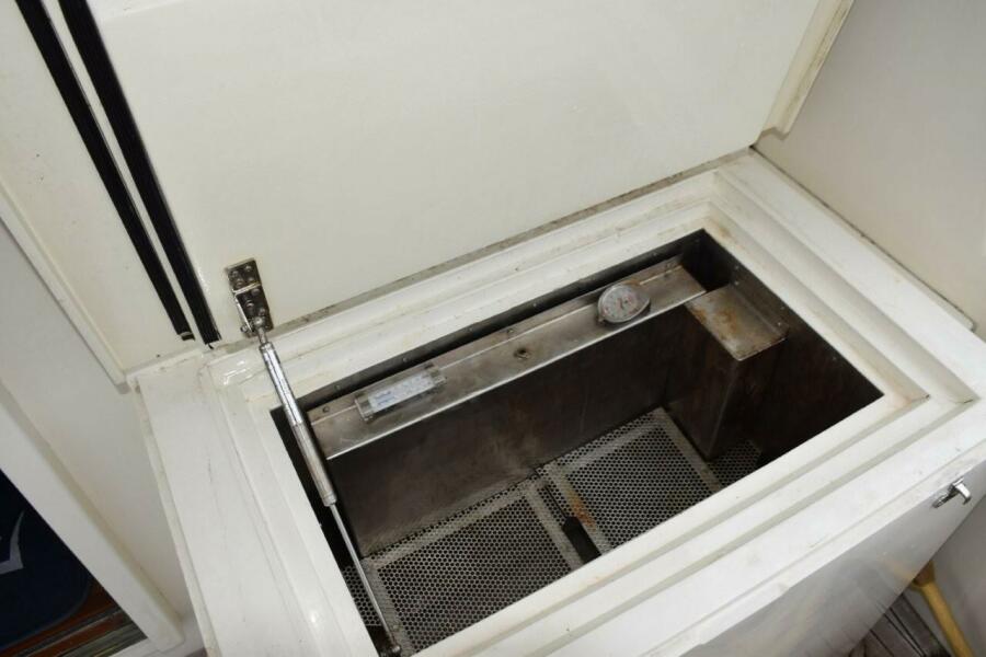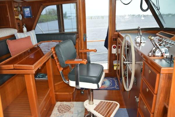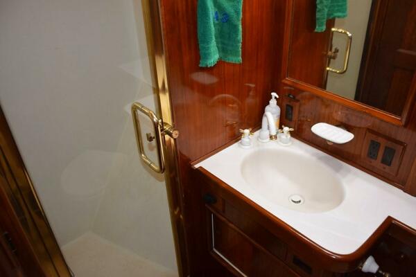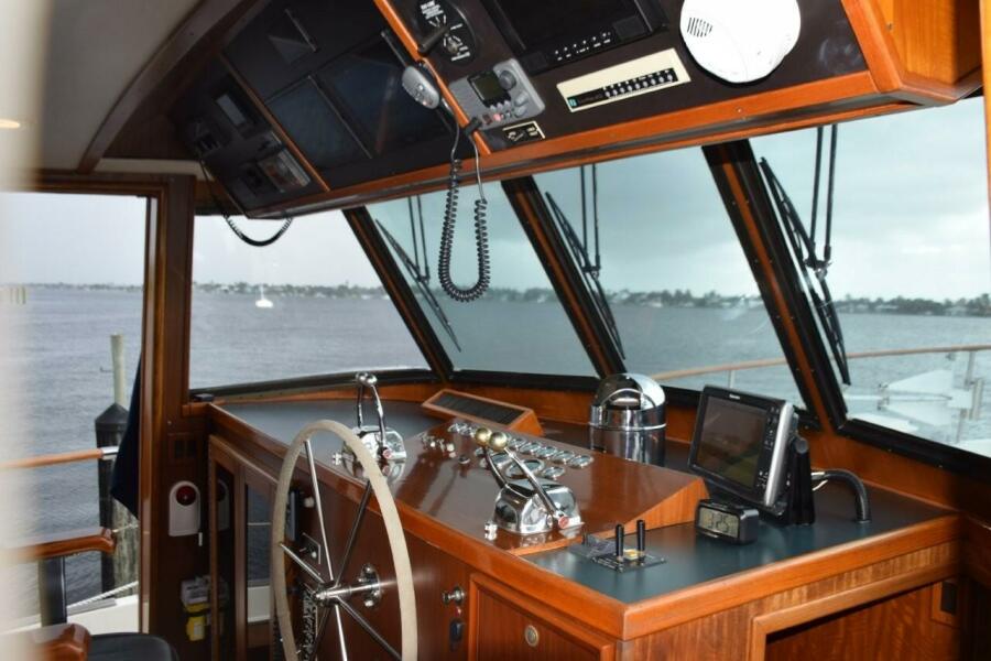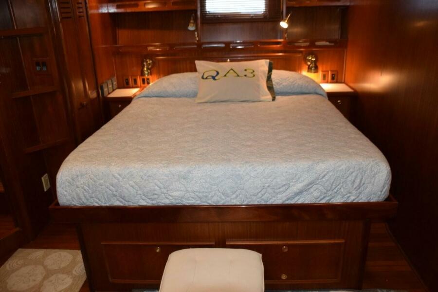 Master Stateroom Mid-ship with walk-around King berth athwartships off the port side, generous drawer and locker storage, large opening portlights and ensuite head with a vanity, sink, electric toilet and spacious stall shower with seat and portlight. Forward from the companionway and up spiral steps to the Pilothouse is a center-line helm, with Watch Berth above and behind the raised leather settee. Slide opening wing doors port and starboard to spacious side decks. Back inside it is down three steps to the saloon with U-shaped galley to port, L-Shaped Settee aft to Port, and comfortable lounge chair to Starboard.