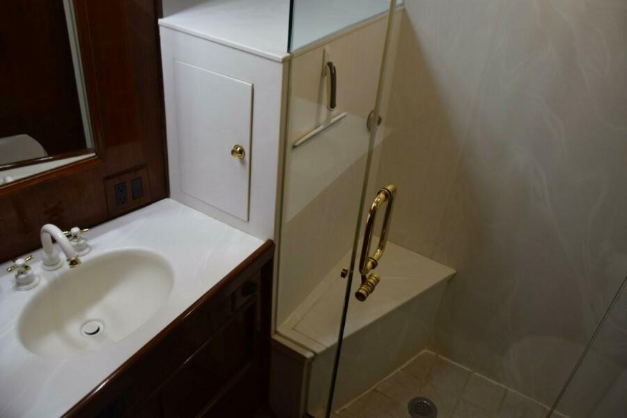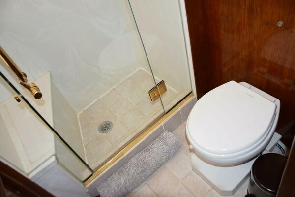 The Guest Stateroom is forward with a spacious V-Berth, reading lights, generous drawer and locker storage, built-in seat with cushion, two opening port lights, teak sheathing on hull sides and an opening hatch overhead. The Guest head is just aft to starboard with a vanity, sink, electric toilet, stall shower and opening portlight.