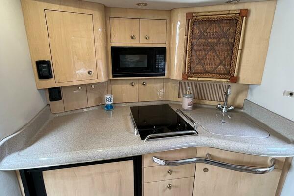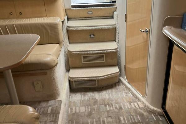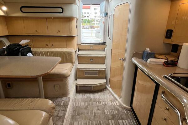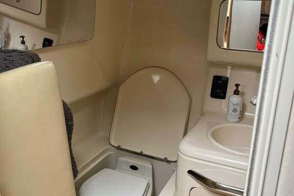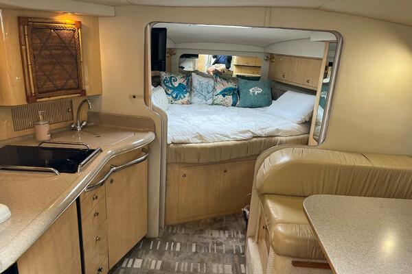 She is a very roomy boat for her size thanks to her 13'5" Beam. The layout features a large, angled sleeping berth in the bow with ample room for two people that closes off with two sliding doors from the rest of the boat. Additionally, the spacious dinette to the starboard side converts to an additional berth. Across from the dinette area is the galley area and enclosed 'wet' head.