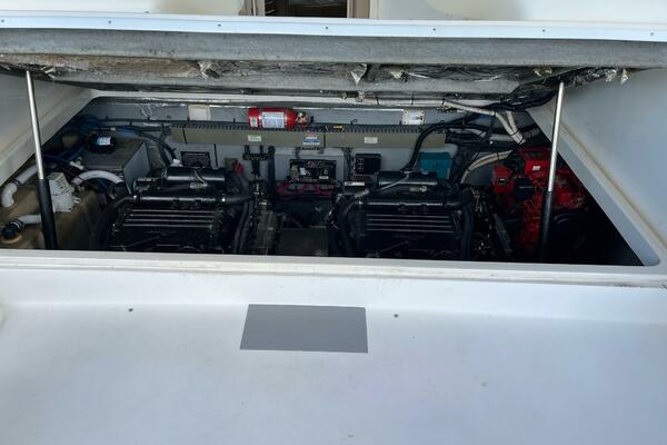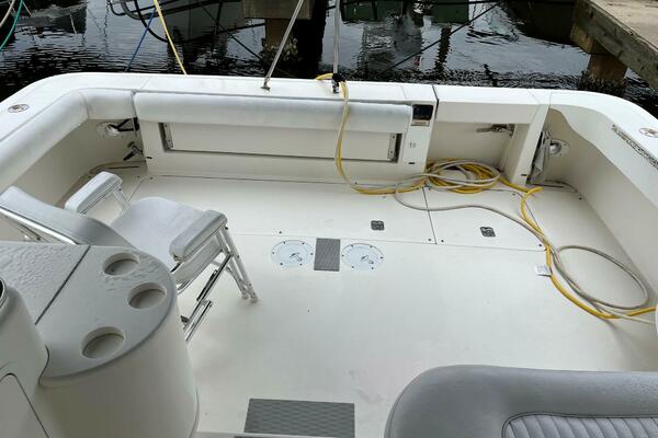 Engine room access is through a hatch between the helm seats or by electrically raising the entire bridge deck. The cockpit also includes a sink, a transom fold down bench seat, baitwell and fish box.