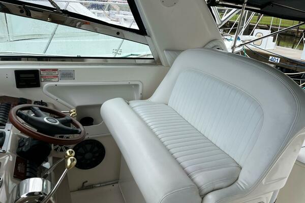 The gloss finished light cabinetry throughout the boat is in excellent condition and along with the large storage area beneath the cabin sole provides excellent storage space. Something that is much needed for any extended cruising. The forward angled radar arch anchors the canvas covering the helm area and aft deck area. There are two double adjustable helm bench seats with additional seating behind the port seat.