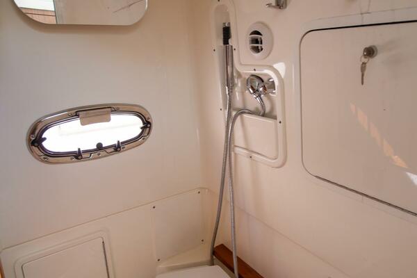 - Freshwater - hot and cold, sink and shower in console, pull-out shower at transom and dive door