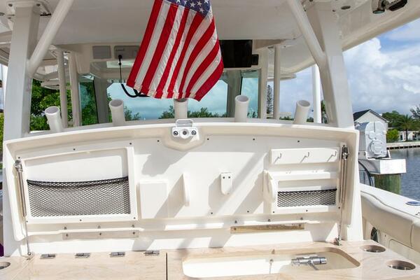 - Air-conditioned helm deck boasts seating for the captain and two companions with bolsters and fold-down arm rests.