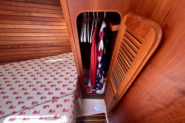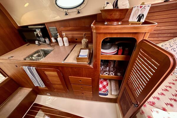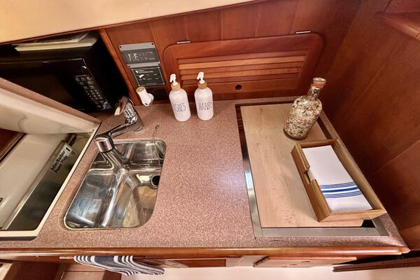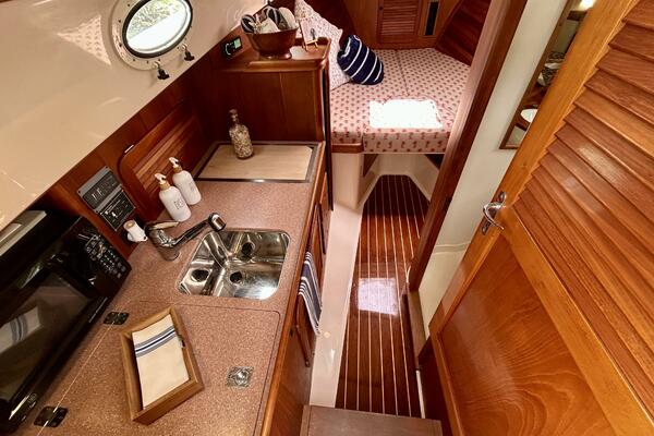 - Lower Cabin Amenities: Galley with microwave, refrigerator, gas stove, and private head.