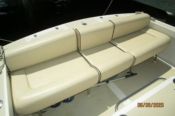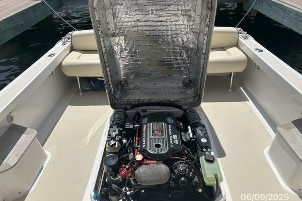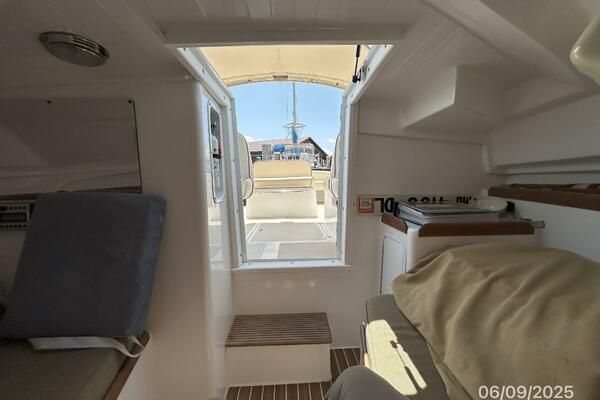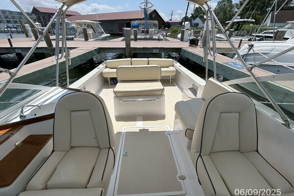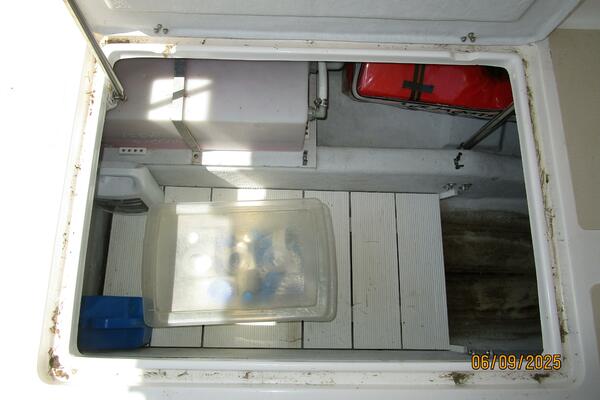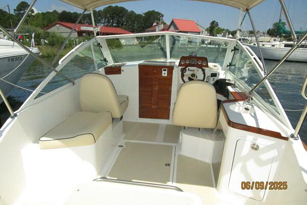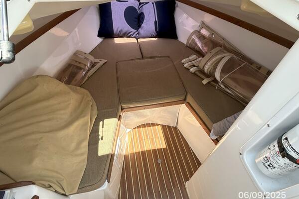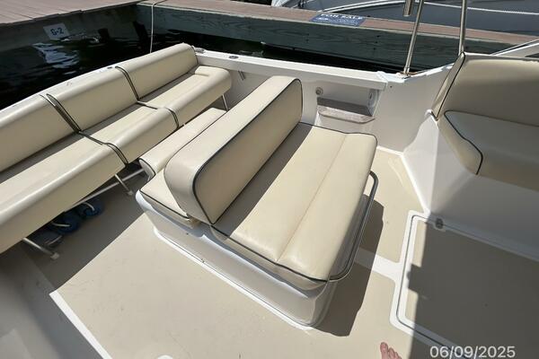 There is a removable aft benchseat in the cockpit, a removable fore and aft facing seat above the engine compartment, benchseat port forward and a wetbar starboard forward. Walk forward and the helm is starboard forward, mate seat port forward and a large storage area below the deck. Step down into the cabin to find a v-berth, head and storage compartment.