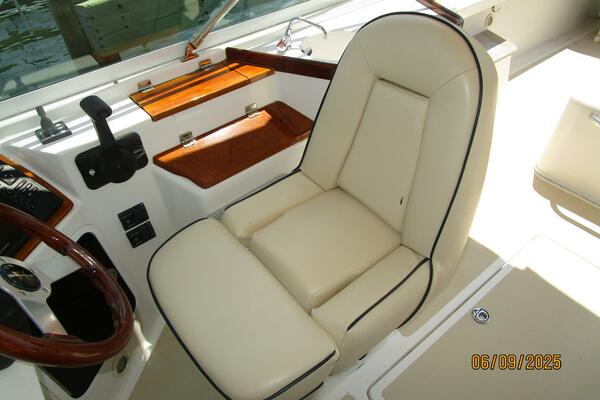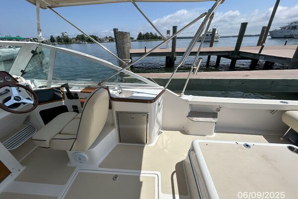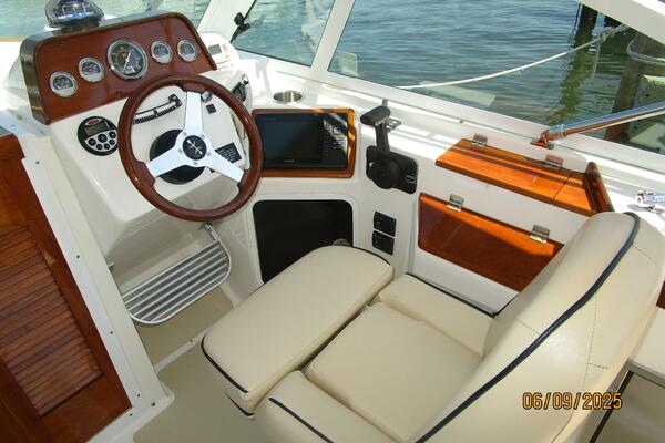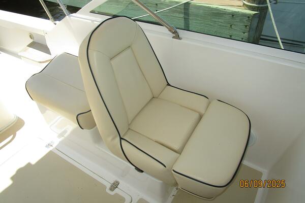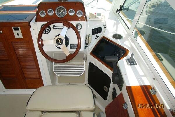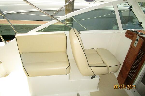 The helm offers a bimini, forward Eisenglass panels, helmseat, mate seat port forward, benchseat with storage to port, below-deck storage, Faria gauges, Roca windshield wipers, Clarion stereo remote control, Volvo-Penta engine control, bowthruster control, trim tabs controls, opening side windows, foot rest, electronics as detailed in the electronics section of this presentation and a teak & glass hatch to the cabin.