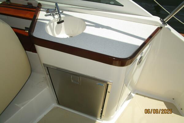 The large cockpit offers removable aft seating, transom storage, removable fore and aft facing seating above the engine compartment, main engine access, non-skid deck, molded-in steps to each side deck, wetbar with sink and Isotherm stainless steel refrigerator/freezer starboard forward and a benchseat with storage port forward.