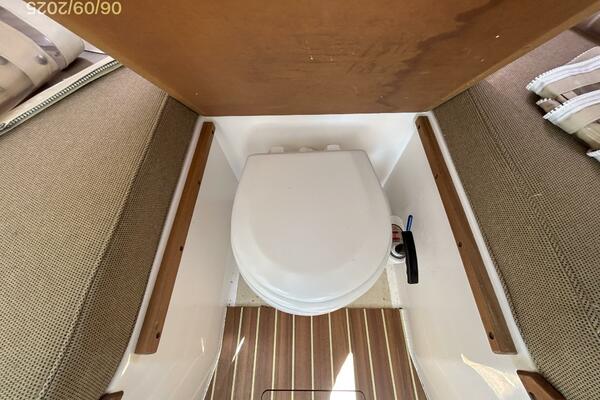 Twilight offers a v-berth, Headmate manual head, mirror and storage cabinet in the cabin.