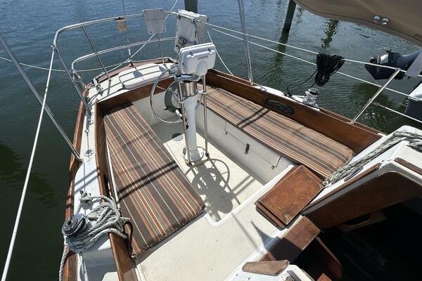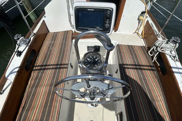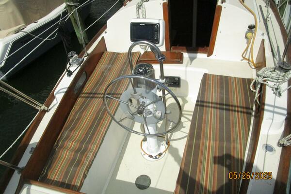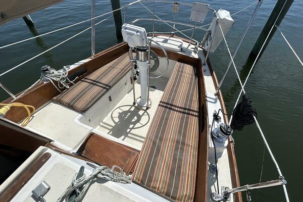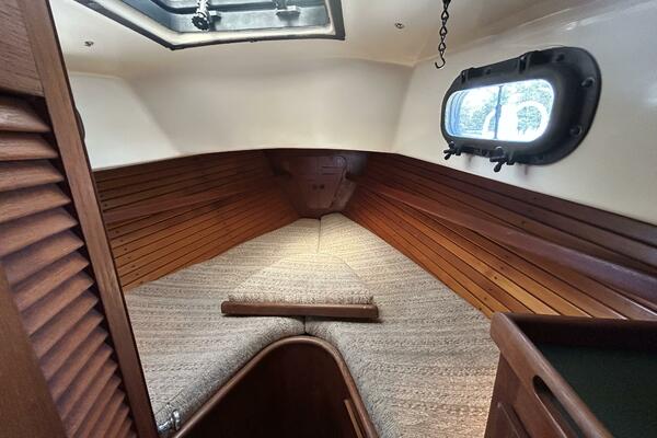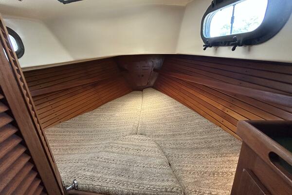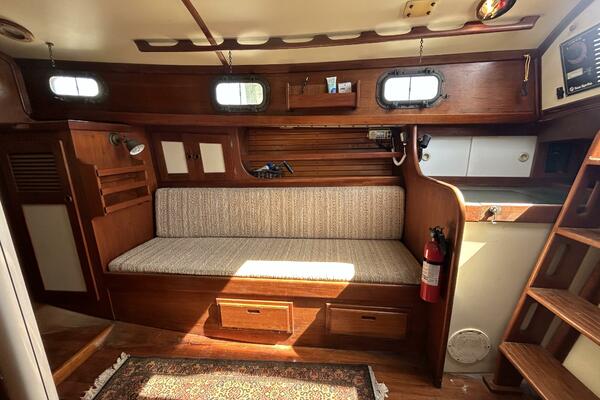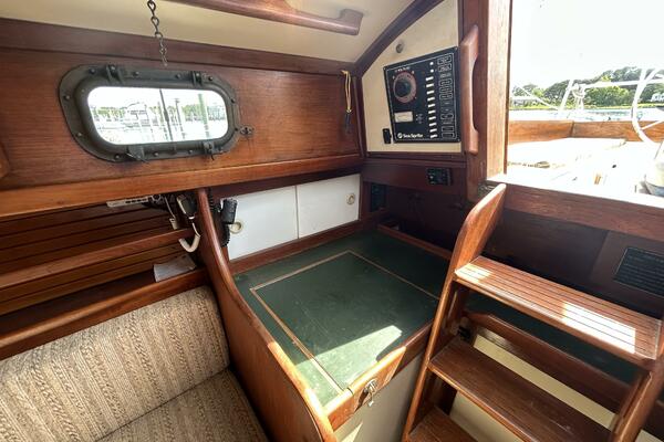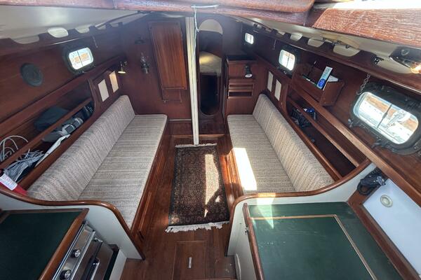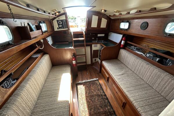 From the cockpit, you step down the companionway into the salon and find a nav station, electrical panel and ice box starboard aft, benchseat/berth to starboard, benchseat (converts to a double size berth) to port, drop down table centerline and galley port aft. Walk forward and you will find the stateroom forward and head to port. Auxiliary access is via the removable companionway stairs.