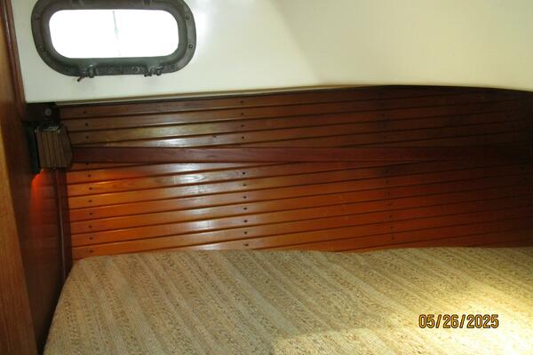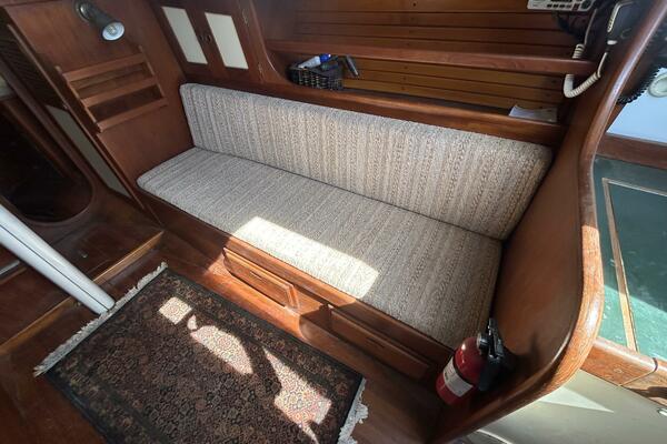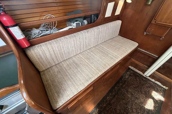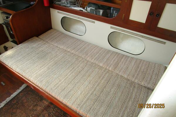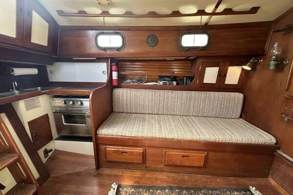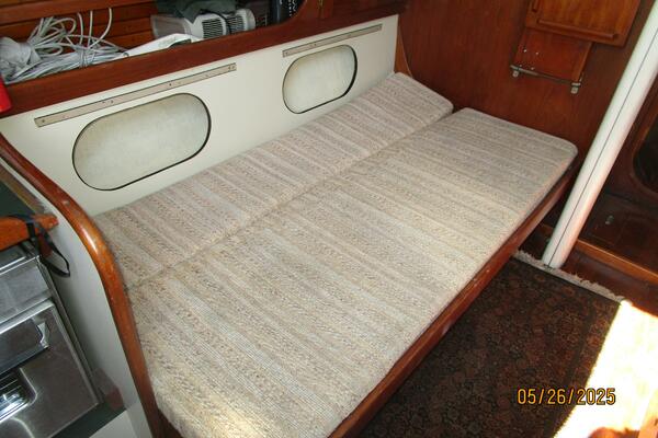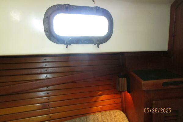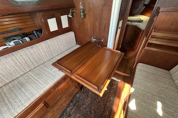 The salon offers a hanging locker starboard forward, benchseat/berth with storage on each side (Port converts into a double size berth), reading lights, 5 portlights, Bomar overhead hatch, book shelves, shelves, storage cabinets, wood sole, fold-down table centerline and auxiliary access.