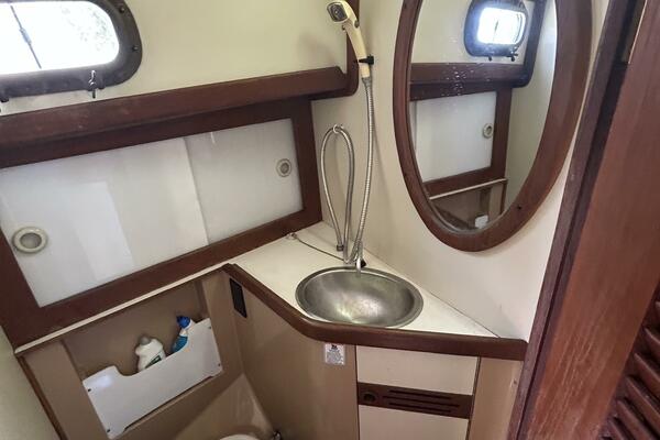Spirit offers a stateroom forward with a v-berth and insert, shelves, Bomar overhead hatch, 2 portlights, reading lights, hanging locker, storage drawers, wood sole and anchor chain locker access. The salon port benchseat converts into a double size berth also. the head is port forward and offers a Jabsco manual head, stainless steel sink, shower faucet, storage cabinets and a portlight.