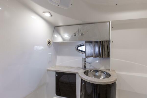 - Molded private head compartment w/vanity, high-gloss Deep Cherry-finish lower doors, Corian countertop, polished stainless steel sink w/swivel faucet, porcelain Flush and Forget® VacuFlush® head unit, 50-gallon holding tank & dockside pumpout, separate shower area w/molded-in seat & exhaust fan
