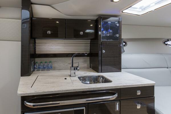 - Complete galley in high-gloss Deep Cherry finish w/storage & hardwood dovetailed drawers, full Corian countertop, 120V/12V polished stainless steel refrigerator, polished stainless steel sink, concealed electric stove w/safety shut-off switch, microwave oven, Krups® 5-speed blender & concealed trash container