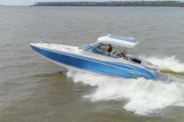 The 2017 Formula 370 Super Sport “Bluebird” is a sleek, aggressively styled sport cruiser with an enviable combination of superior construction, first-rate accommodations, and excellent open-water performance. She’s basically a Euro-style sport boat with considerably more cockpit space and less interior volume than traditional express cruisers. Performance is important in a boat like this, and the 370’s narrow beam and high-speed stepped hull deliver the fast ride and luxurious accommodations that few other sport boats can match. Her spacious and well-equipped cockpit provides seating and amenities for a small crowd. A removable cocktail table stores in a transom storage locker, and a cockpit galley comes complete with a sink, cooler, and refrigerator. The cabin of the 370-among the more impressive in her class, includes a wraparound V-berth, dinette forward, mid-berth cabin aft, and a compact galley to port with stove and refrigerator. Additional features include a walkthrough windshield, transom shower, tilt steering, and a flip-flop bolster seat at the helm.