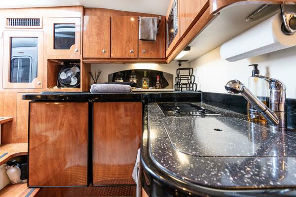 - Galley with refrigerator, freezer, two-burner cooktop, and ample storage