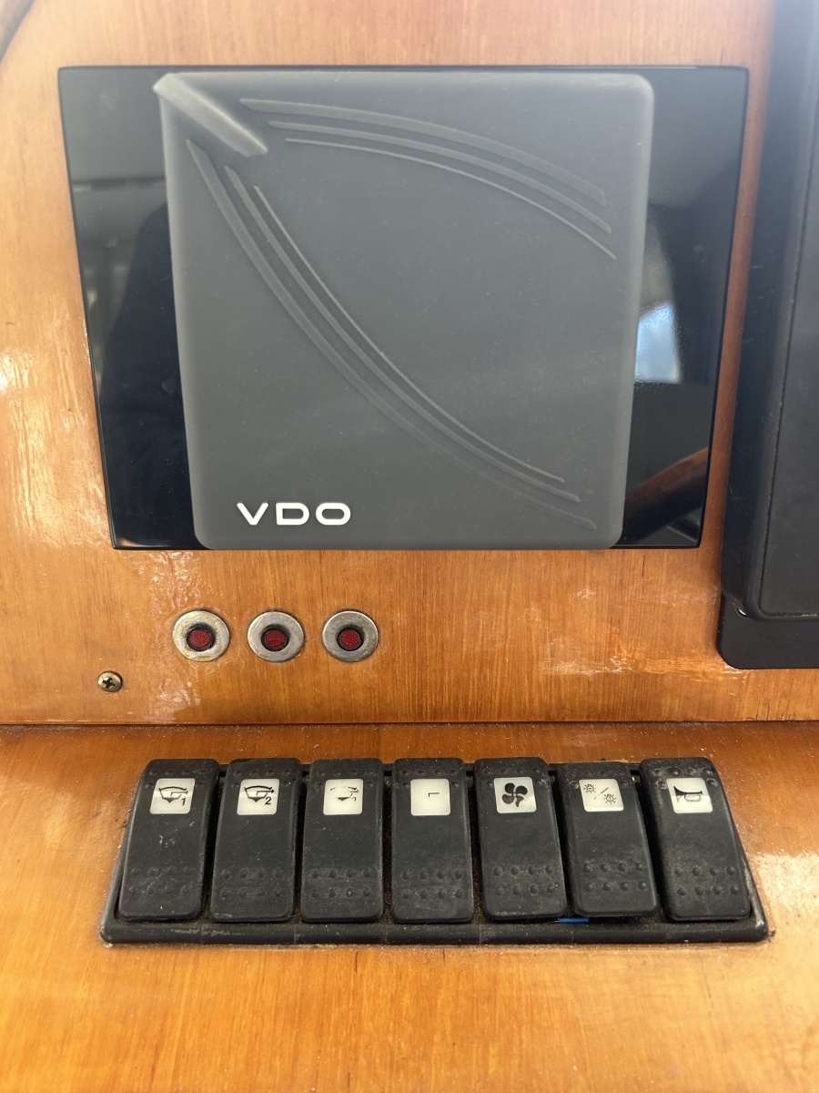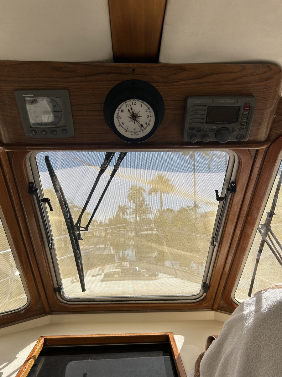 Forward of the settee's to starboard is the Helm Station with an adjustable hi/lo helm seat and to port an additional helm seat. Also to port is the generator display panel. Forward center window opens for ventilation. Overhead skylight / hatch over each helm seat.