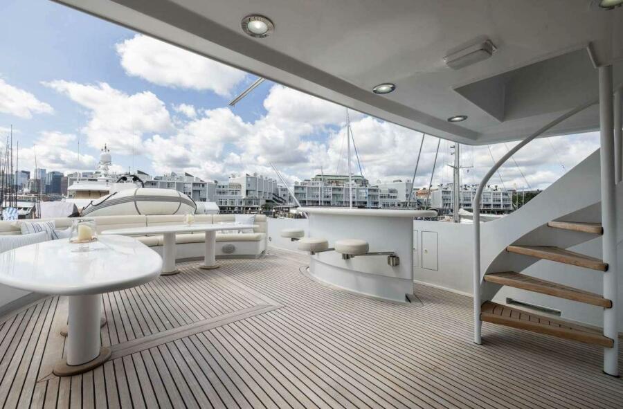 The spacious aft deck welcomes guests with a large dining table for alfresco meals, cushioned seating, and direct access to the swim platform below. Wide teak steps lead down to the platform, creating an inviting area for swimming, diving, or boarding tenders and water toys.