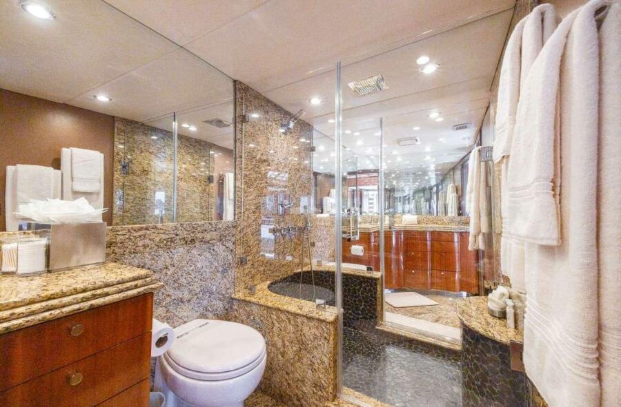 Forward on the main deck is the full-beam master suite—a standout feature rarely found on yachts of this size and pedigree. This private retreat offers panoramic views, a king-size berth, ample wardrobe storage, and a beautifully appointed ensuite bathroom with marble finishes, including a spa-style wet-room with a step-down soaking tub inside a glass-enclosed rain shower.