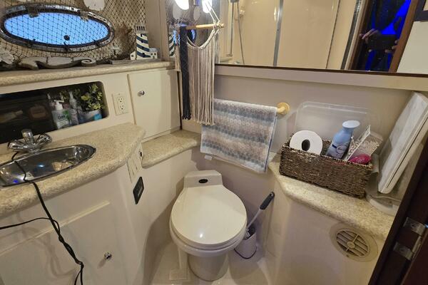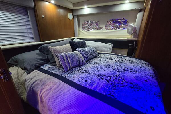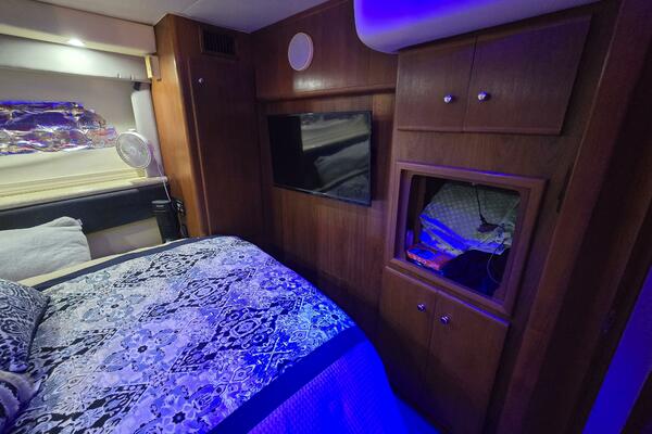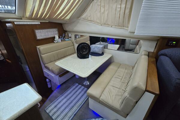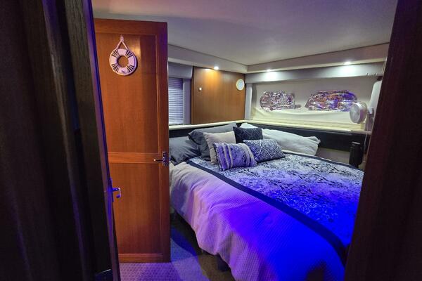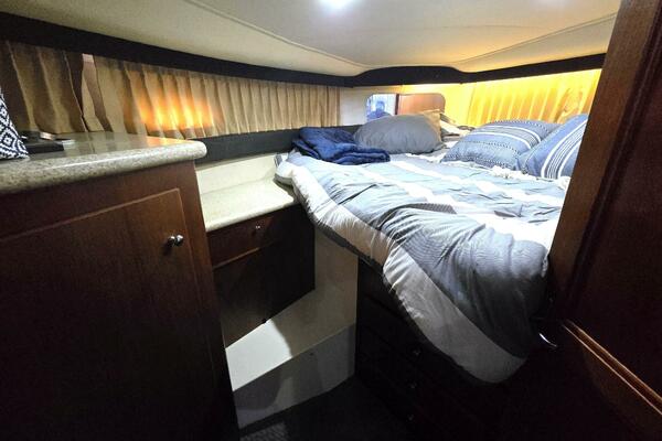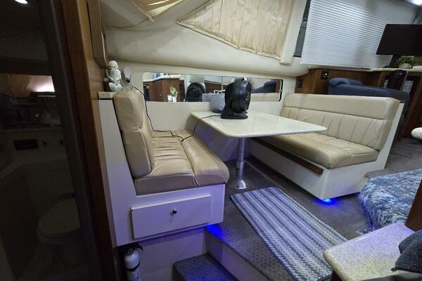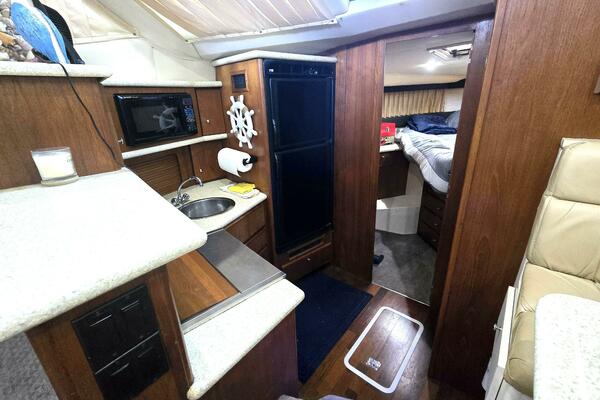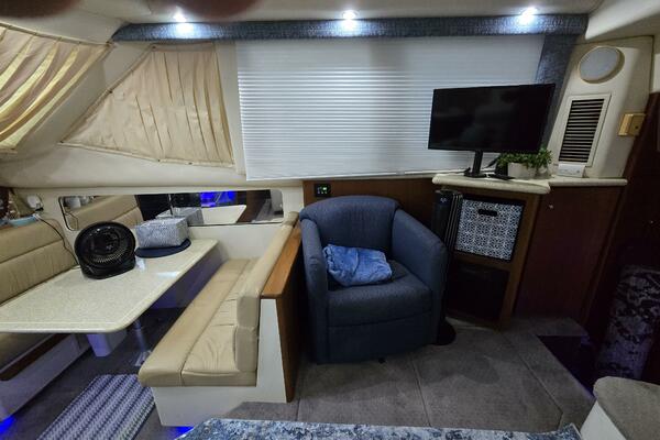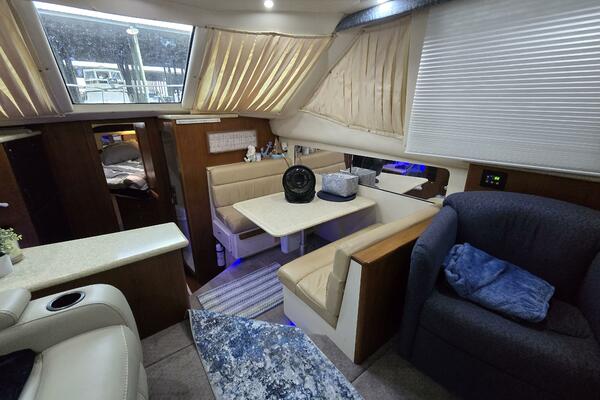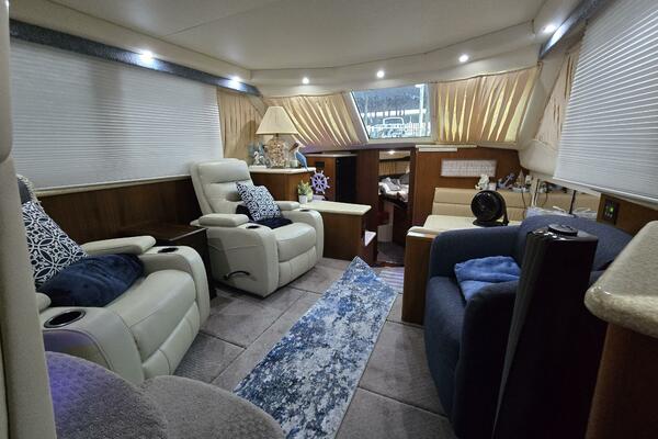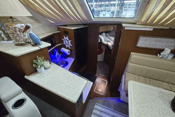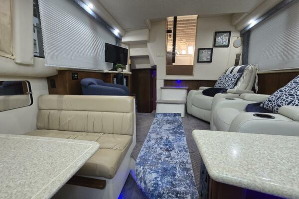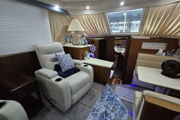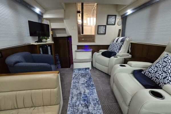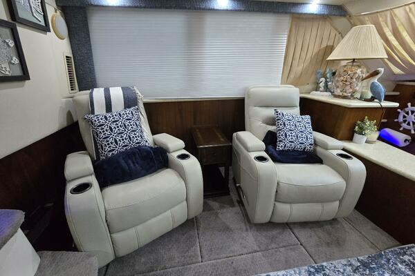 The Carver 356 is a two-cabin, two-head vessel with overnight accommodation for up to six adults. Entry to the interior is via a sliding companionway door on the aft deck, leading into the salon. The full beam salon includes recessed halogen lighting and ash woodwork. Large windows provide natural light and ventilation through aft opening side windows. To port, there are two new Leather recliners, while to starboard, there is a built-in entertainment center and a swivel chair.