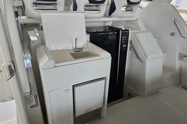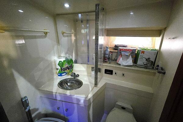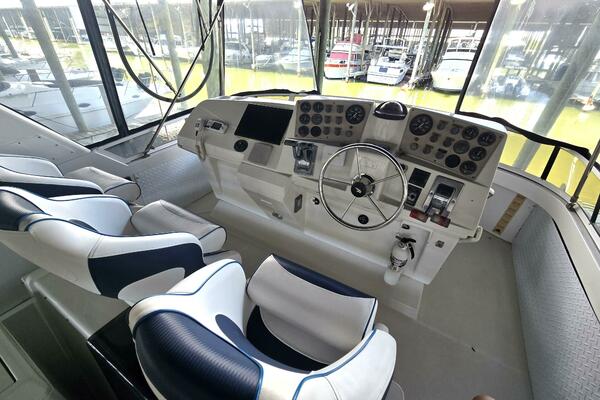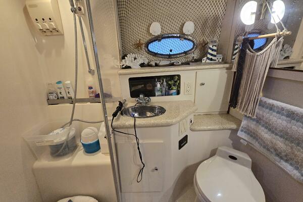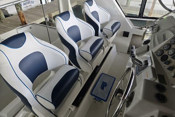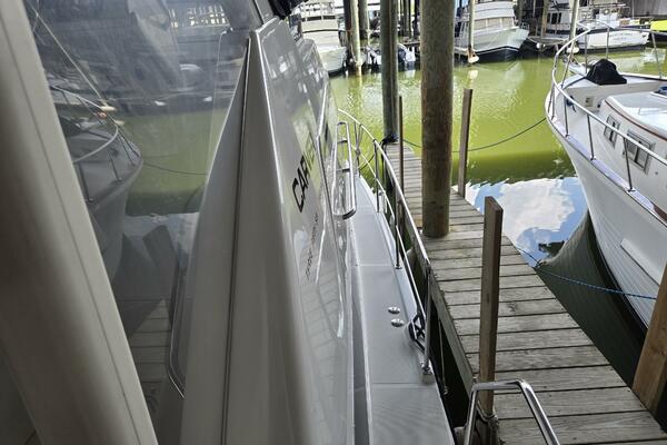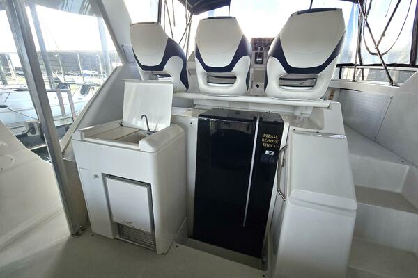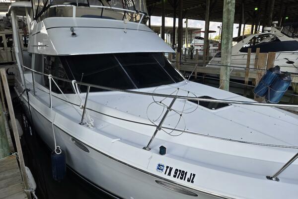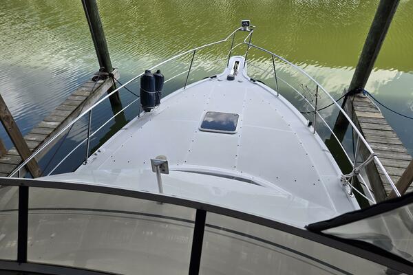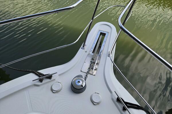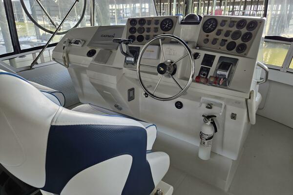 This vessel offers a family-friendly layout with two staterooms and two heads, providing accommodations for up to six individuals. The interior includes a full-beam salon and master stateroom, a spacious bridge capable of seating seven, and a fully enclosed aft deck equipped with a wet bar.