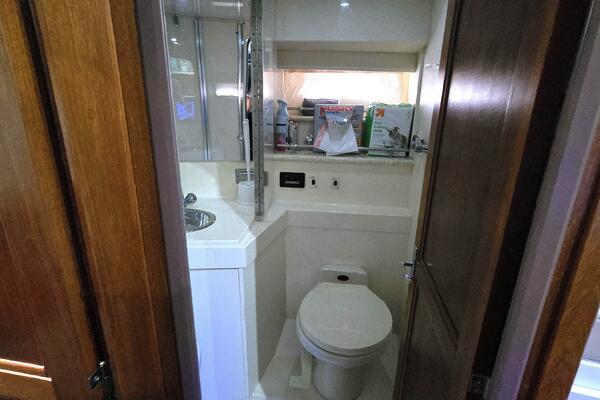 The guest stateroom is forward of the galley and offers an angled double berth with drawer storage, a nightstand, and a hanging locker. Opening ports on both sides and an overhead hatch provide light and ventilation; the hatch also serves as an emergency exit. This stateroom has private access to the starboard dual-entry day head, which includes a VacuFlush toilet, shower, and vanity.