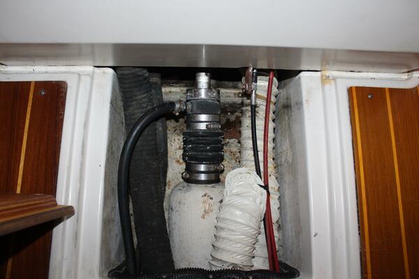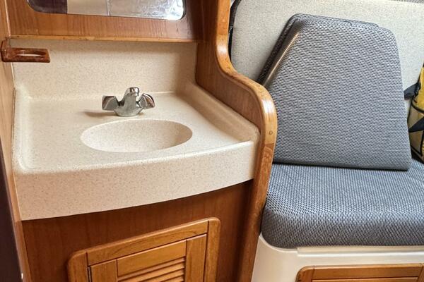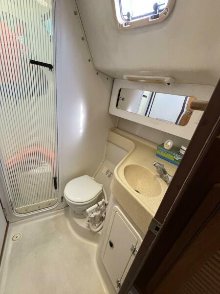 The head is aft of the nav station and forward of the master suite. The head has a separate stand-up shower, vanity and manual commode. There are two doors—one leading to the master suite and one to the salon area.