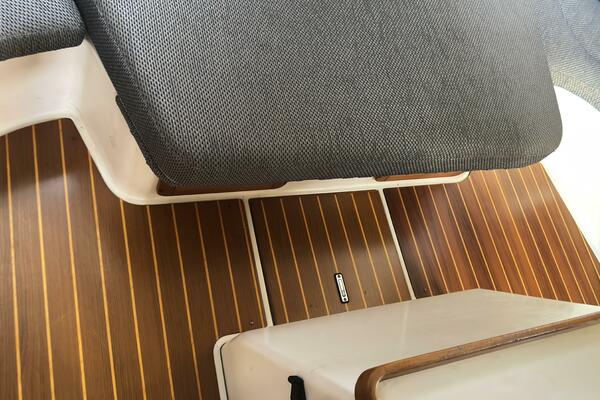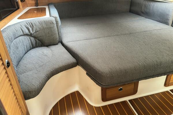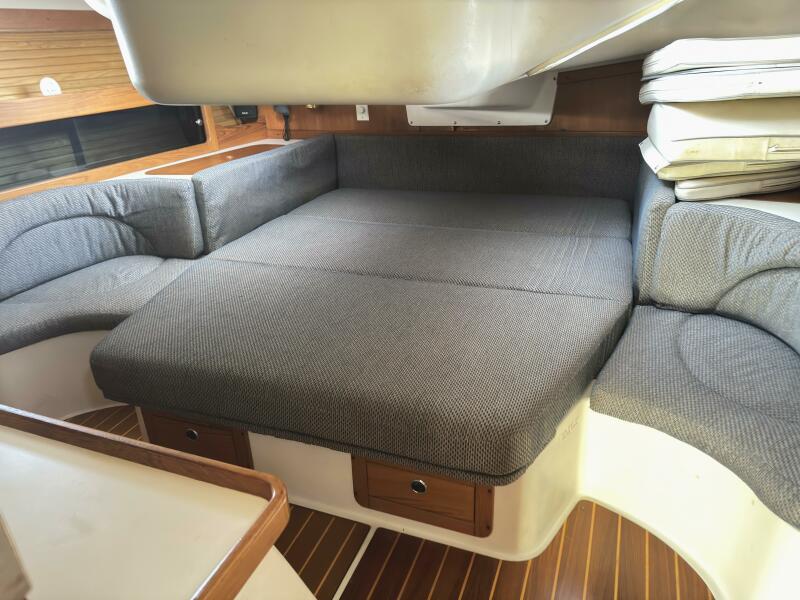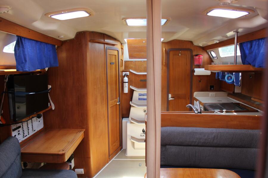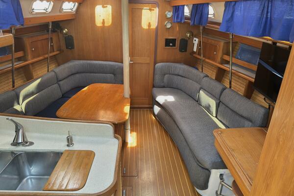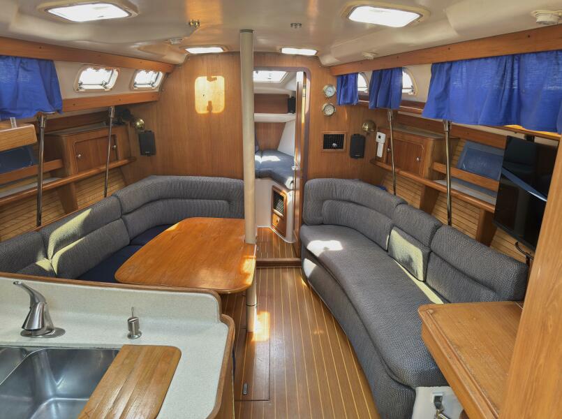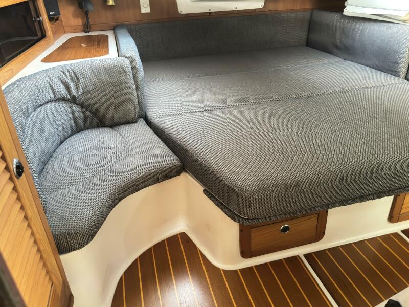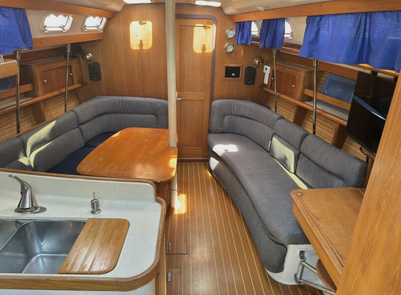 Next aft is the salon with a U-shaped settee to port and a straight settee to starboard. .