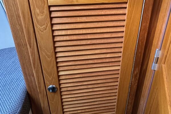 The owner’s stateroom is incredible for a boat in this size range. She has a large forward/aft facing centerline berth with seating on both sides. The teak hanging lockers, drawers and storage cabinets both look good and provide plenty of storage. There is a private door leading to the head.