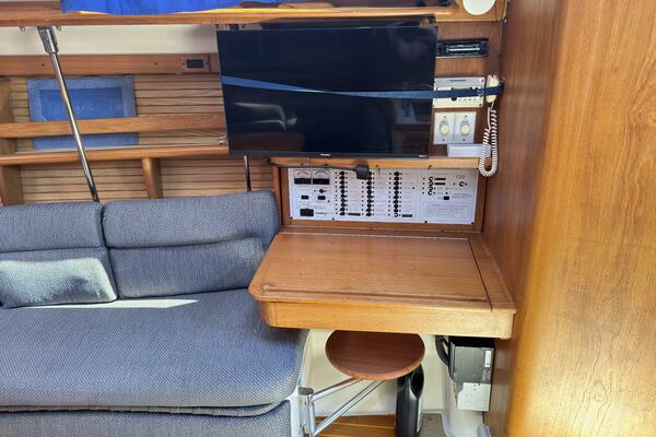 The nav station is to starboard of the companionway and features a large nav table with electronics and AC/DC breaker panel above.