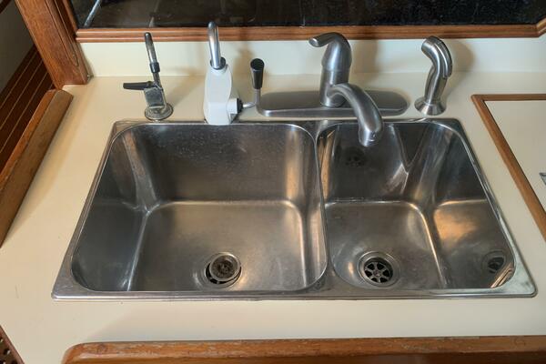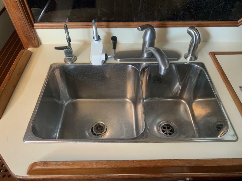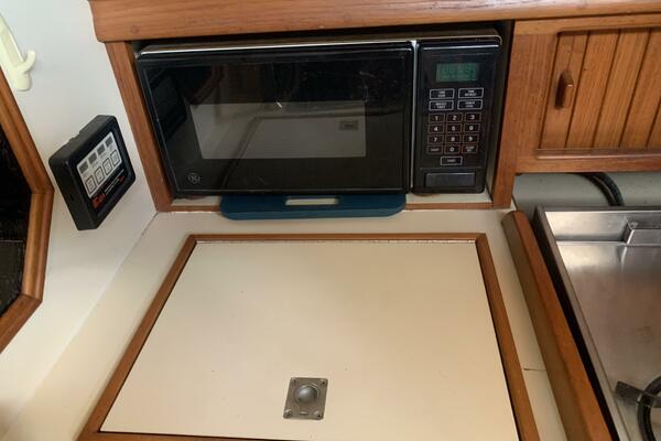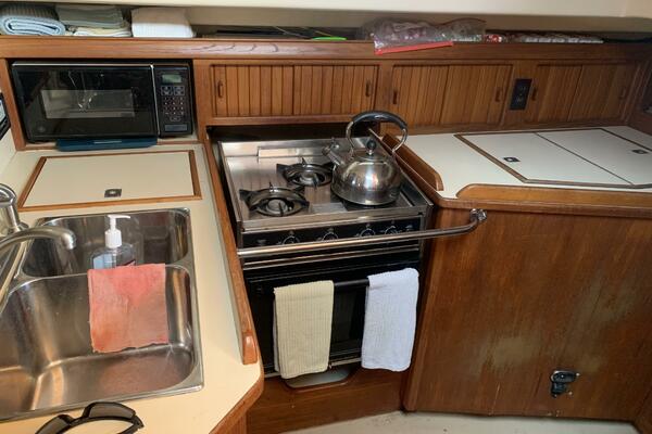 The large galley has an all Stainless Steel gimballed 3-burner propane stove with oven, with pot and pan storage underneath, double s/s sinks with hot/cold pressure water and a manual water pump, refrigerator/freezer, microwave oven, roll away trash bin, and ample storage in the form of cubbies, cabinets, and cutlery drawers.