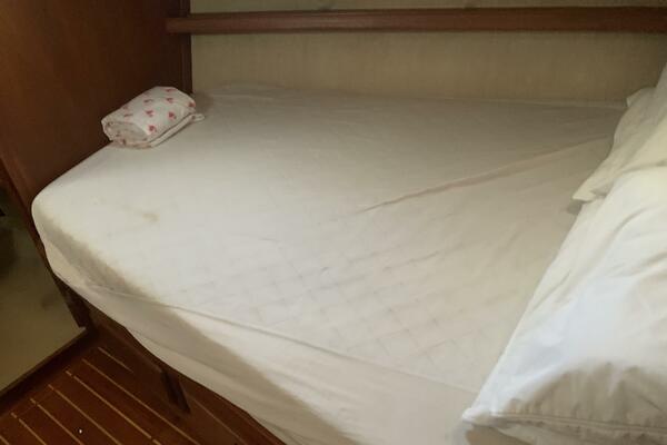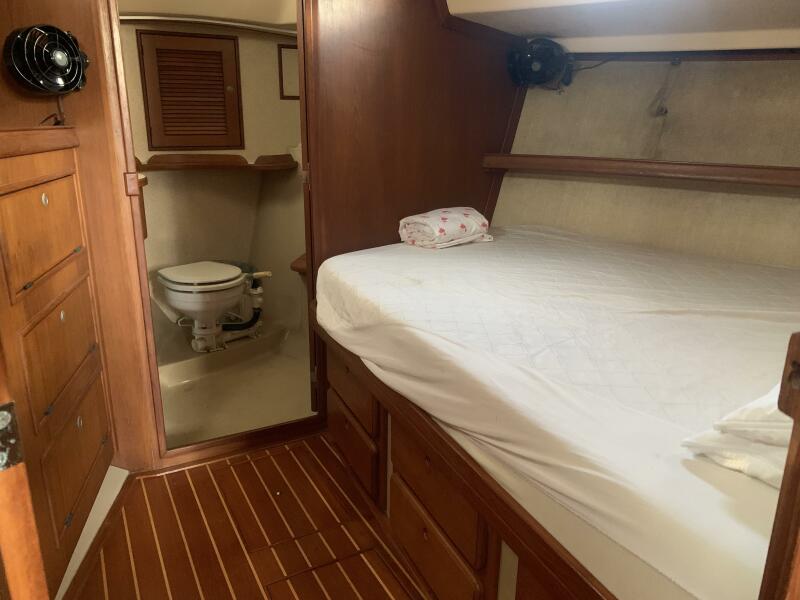 The roomy and comfortable owner's suite is next. It has a queen-sized berth, excellent ventilation, and ample storage with bins and (6) cedar-lined bureau drawers underneath the berth, and to port, a cedar-lined hanging locker and (3) storage bins.