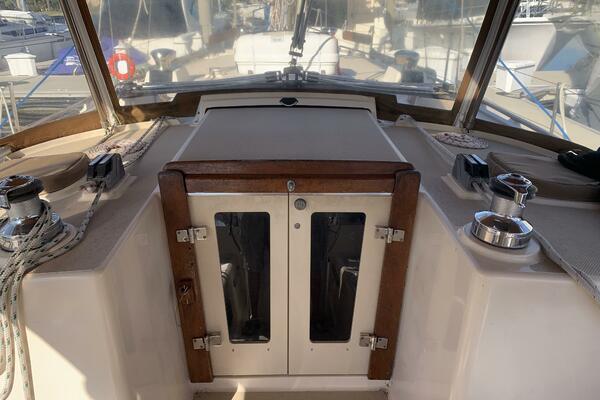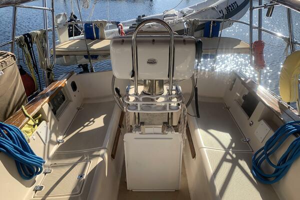 The cockpit is large and comfortable with cockpit seats that are long enough for lounging or sleeping. It has lots of storage, including a cockpit ice box and a large lazarette.