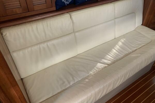 The spacious main salon has a bulkhead-mounted fold-up dining table that expands a second time to provide salon-wide dining. An L-shaped settee, which pulls out to make a double berth, is to starboard with a chart storage drawer underneath. To port is a straight settee, and another cedar-lined hanging locker. There are large storage areas behind and under both settees.