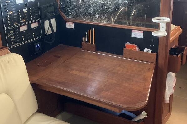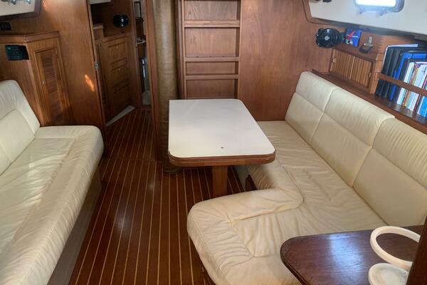 The navigation station, with navigation desk and electrical/instrument panel, is located to starboard and utilizes the end of the L-shaped settee as a seat.