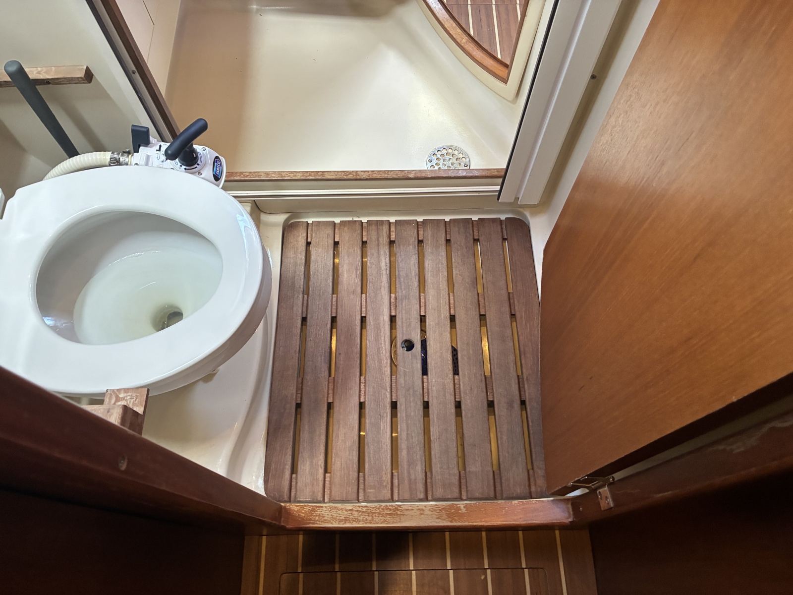 The navigation station located to port is a dedicated chart table, electrical panels, and space for navigation electronics and storage for charts and manuals. Just aft is the guest head, which features a marine toilet, vanity with sink, shower area, and additional storage.