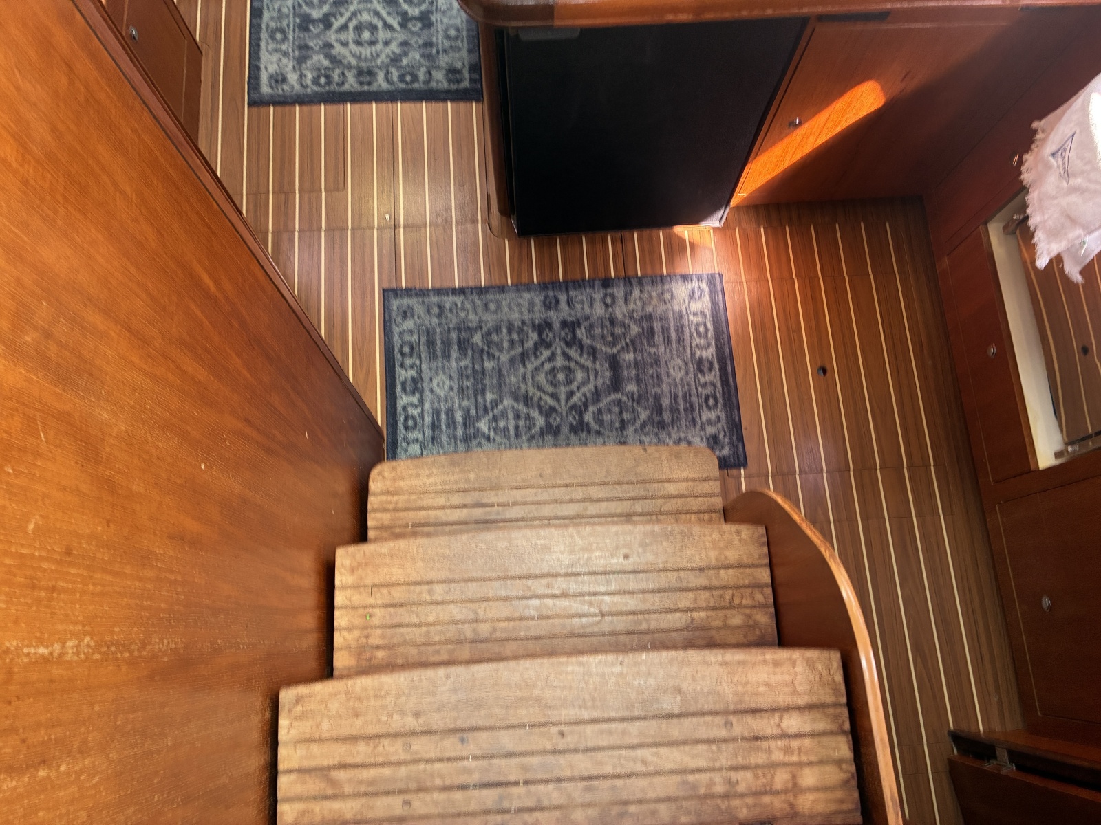 Aft of the companionway to port is the master stateroom, which provides a generous double berth tucked beneath the cockpit. This cabin includes a hanging locker, opening ports for ventilation, and storage for cruising gear.