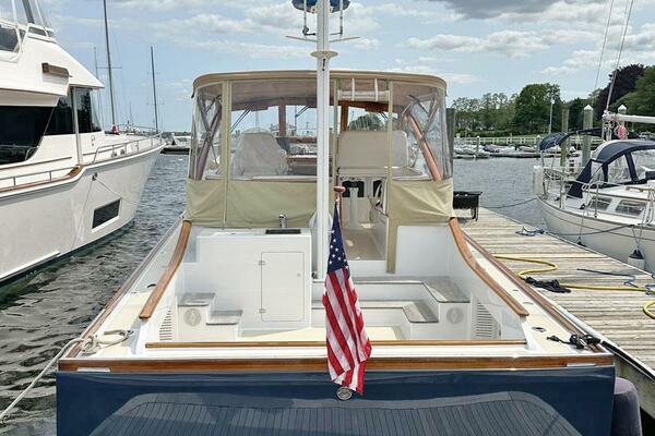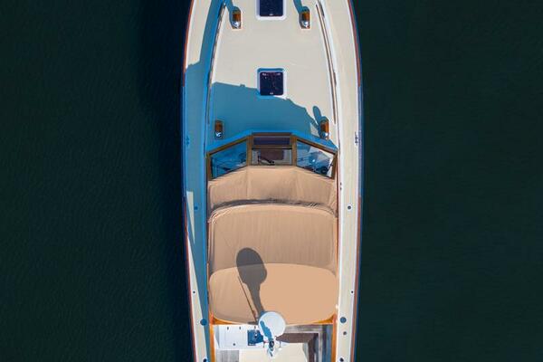 The convertible bimini soft top is a traditional "Toast" Sunbrella color over stainless frame. The front portion of the bimini that attaches to the windshield may be removed to provide additional ventilation. Side curtains and three-piece aft drop curtains fully enclose the bridge deck when desired.
